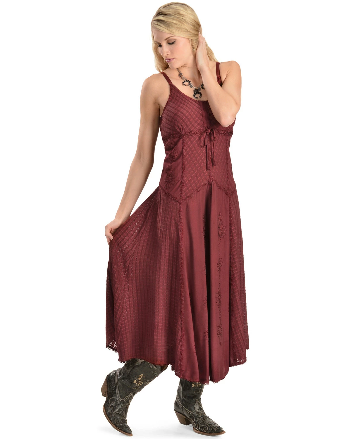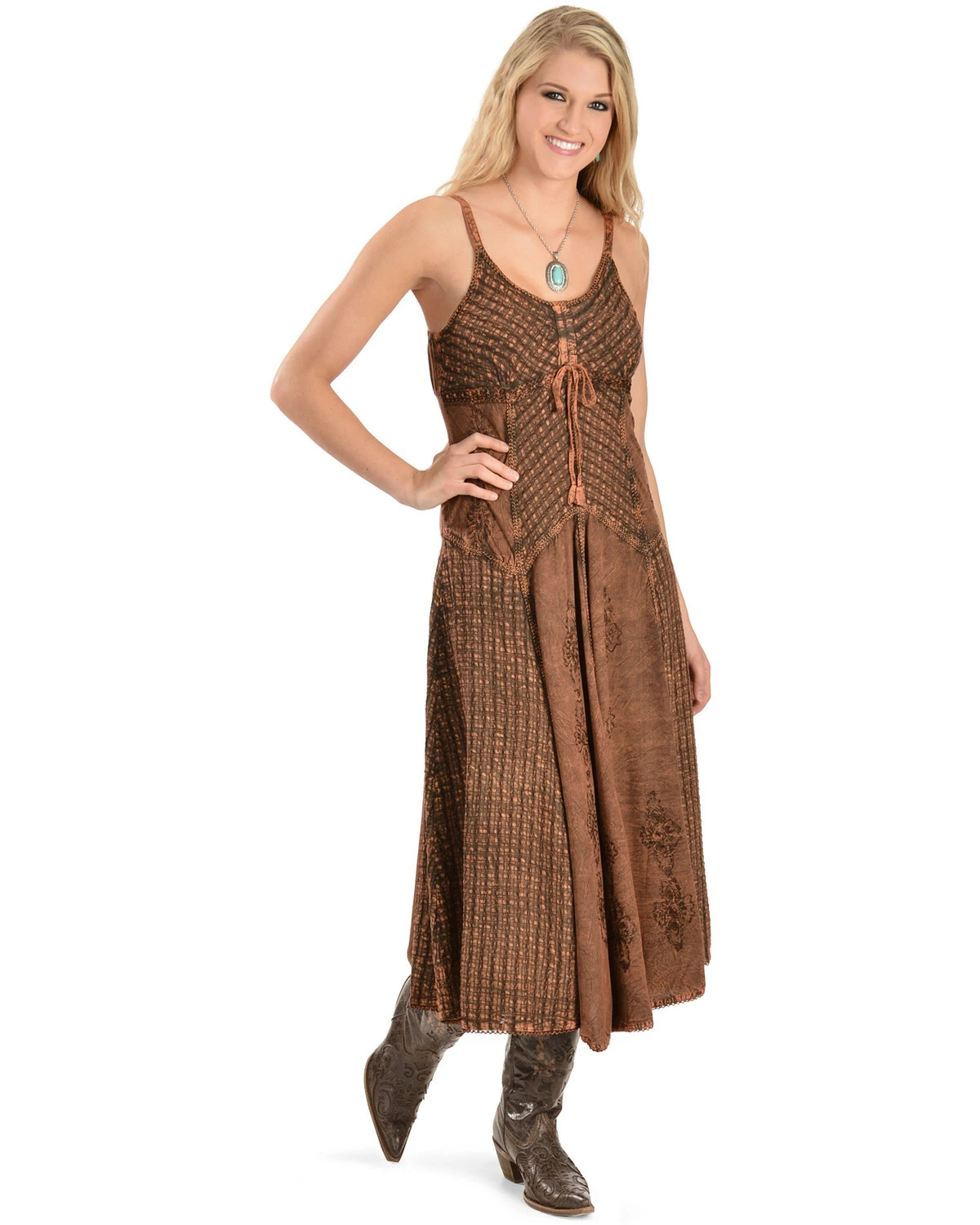 Bring some country charm with this beautiful bohemian Maxi Dress by Scully. Part of the Honey Creek series, this beautiful lightweight dress drapes beautiful around the body. The fit can be adjusted with the adjustable straps, bust area, and tie straps. The skirt of the dress is a floor sweeping circle shape for an elegant womanly touch. Pair this dress with cowgirl boots and take summer walk. You will look and feel good.