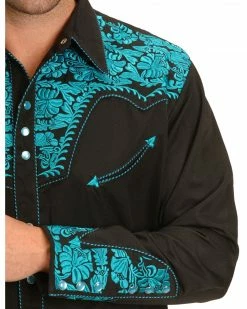 True western design complements every cowboy! This floral embroidered Scully Shirt features handsome embroidery at yokes and cuffs. Shirt has two retro western smile pockets complete with arrow stitching. Pearlized snaps on decorative front placket and six-snap cuffs. Made of 65% polyester/35% rayon. Imported.