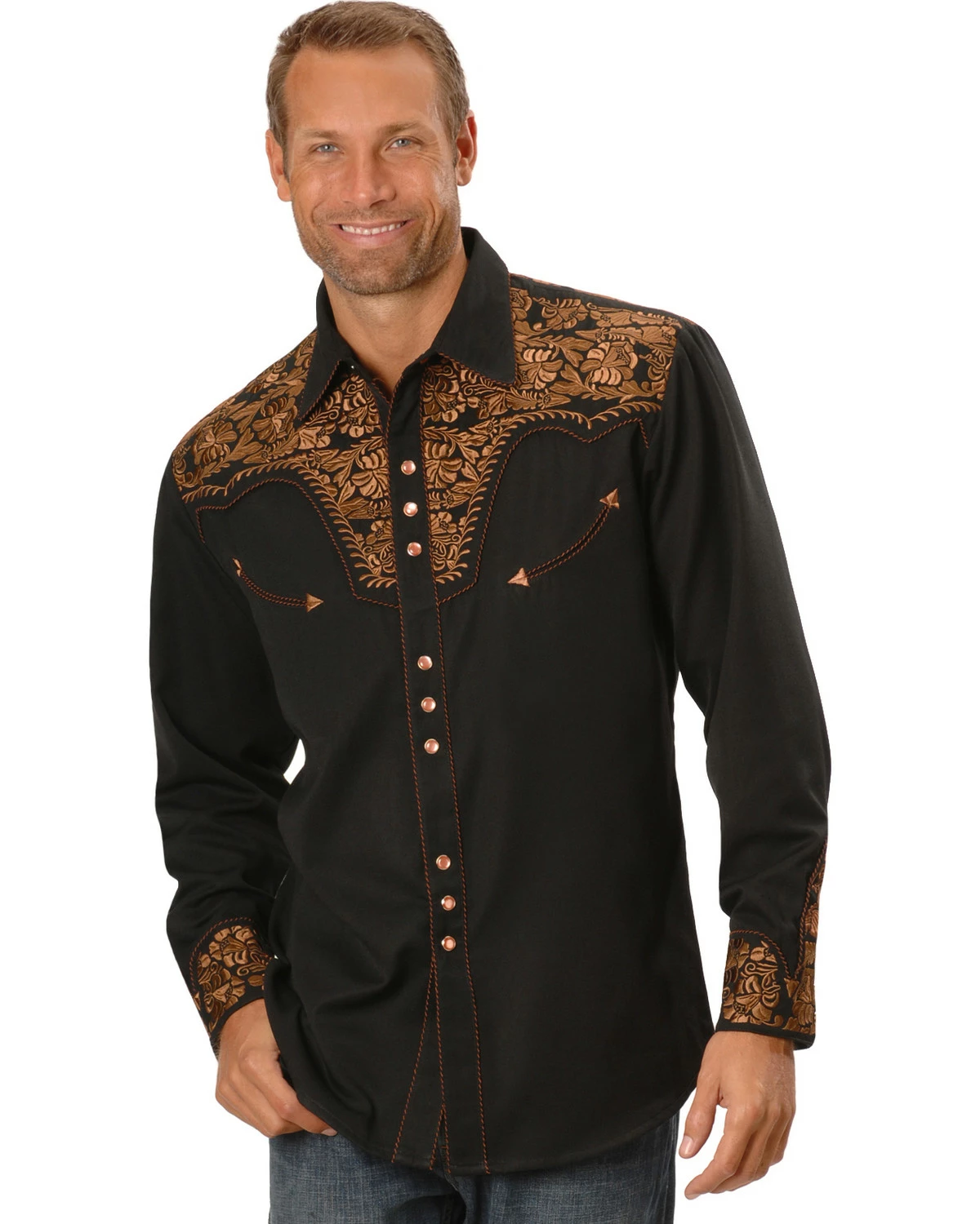 Scully Men’s Copper Embroidered Gunfighter Long Sleeve Snap Western Shirt Black