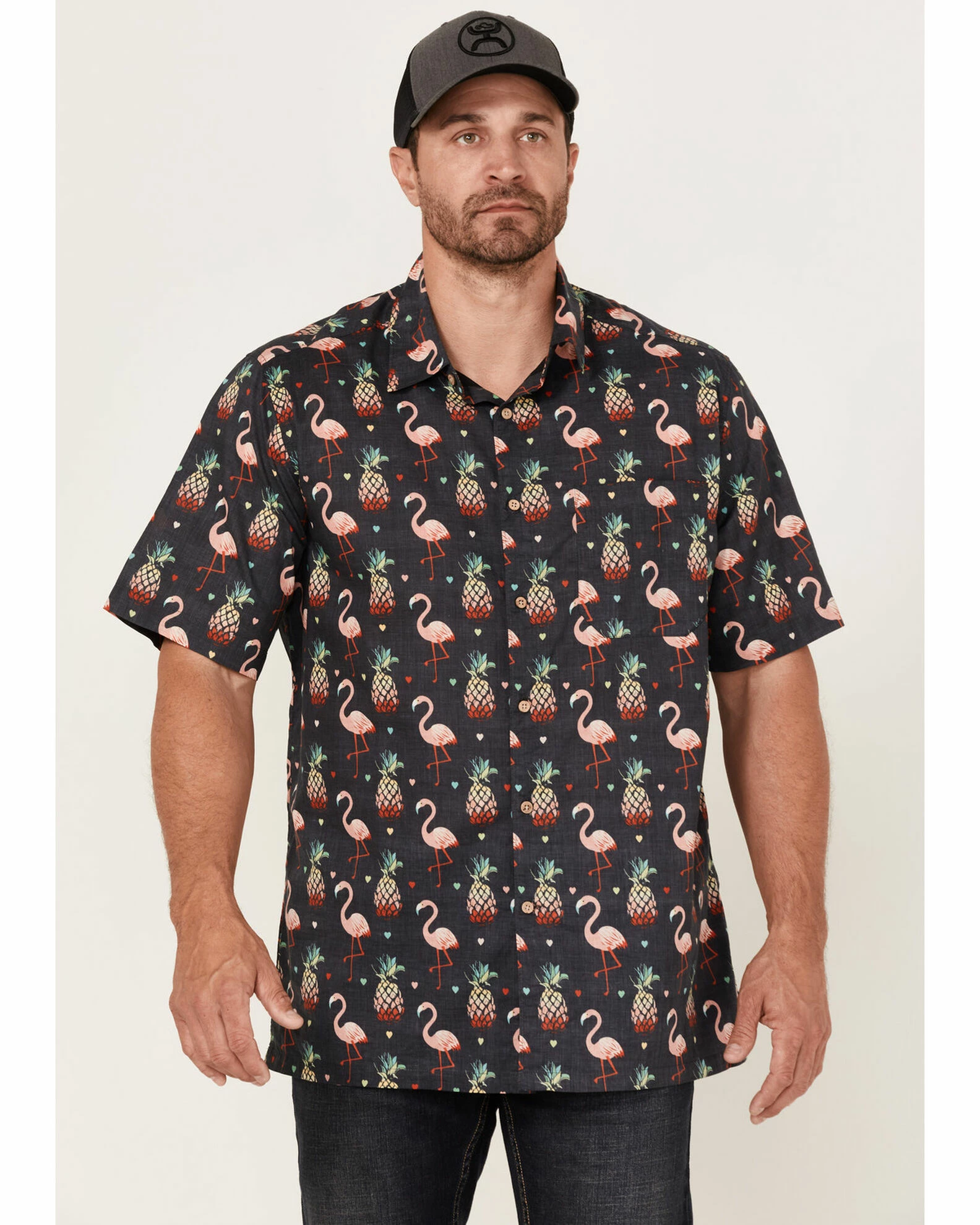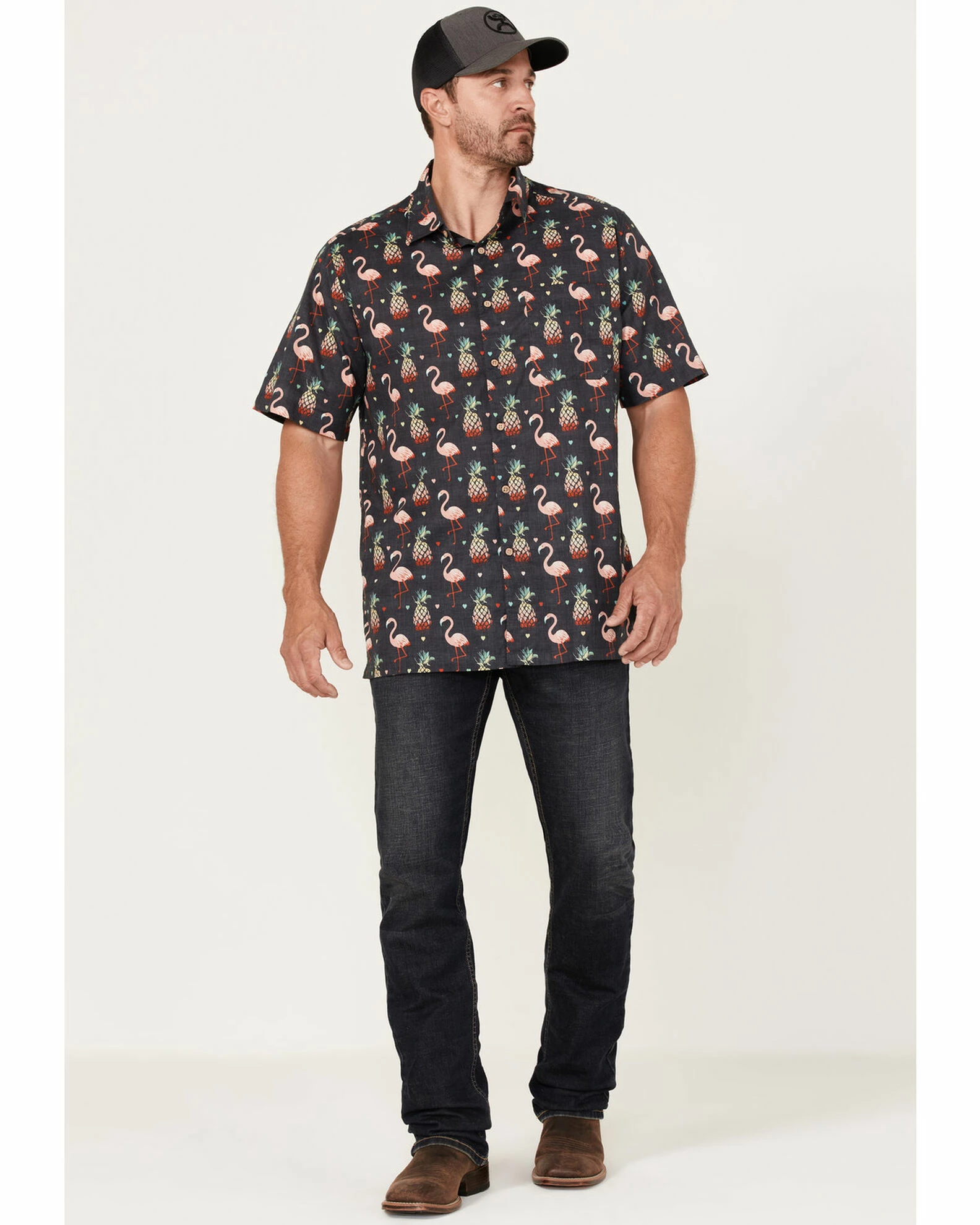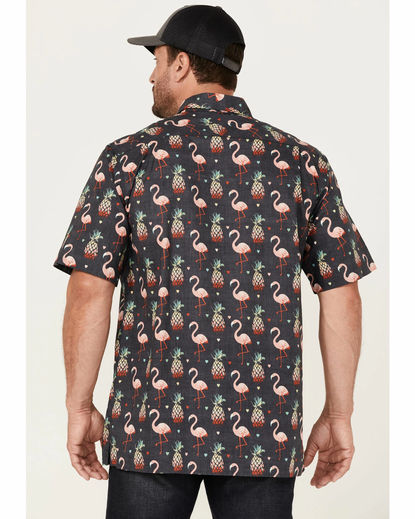 Scully Men’s Pineapples & Flamingos All-Over Print Short Sleeve Button-Down Western Shirt Black