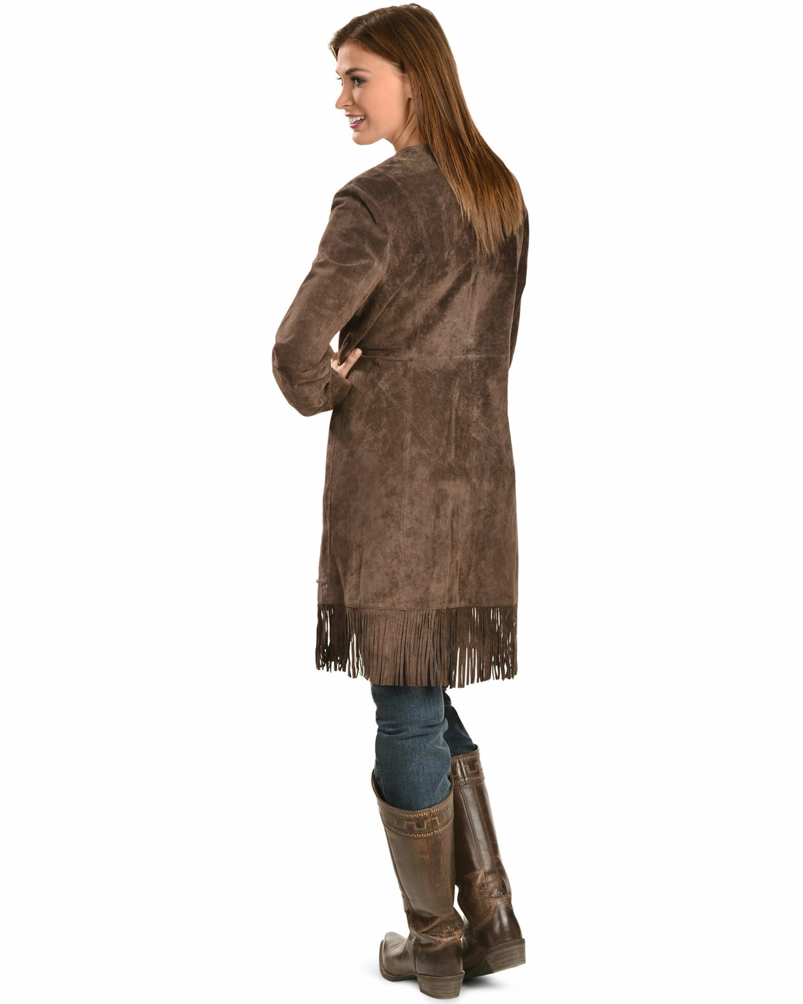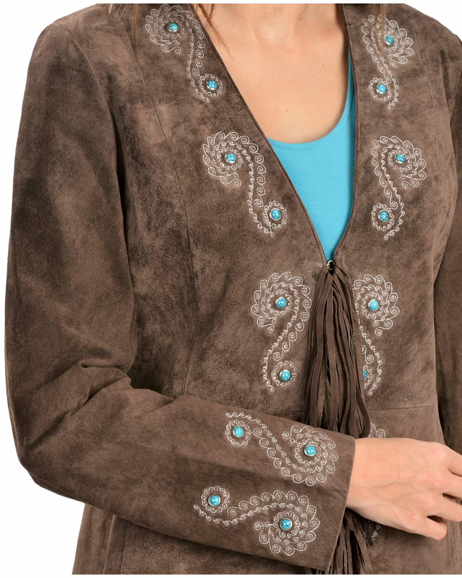Scully has been producing the finest leather products since 1906. This Scully Women’s Fringe Embroidered Suede Coat mixes the old west with contemporary fashion, adding stylish silver thread embroidery and turquoise studs to this fringe coat. The fringe follows the entire hem, while the embroidery and studs line the front, bottom, and cuffs. The only thing that can make this coat any better is you wearing it!
