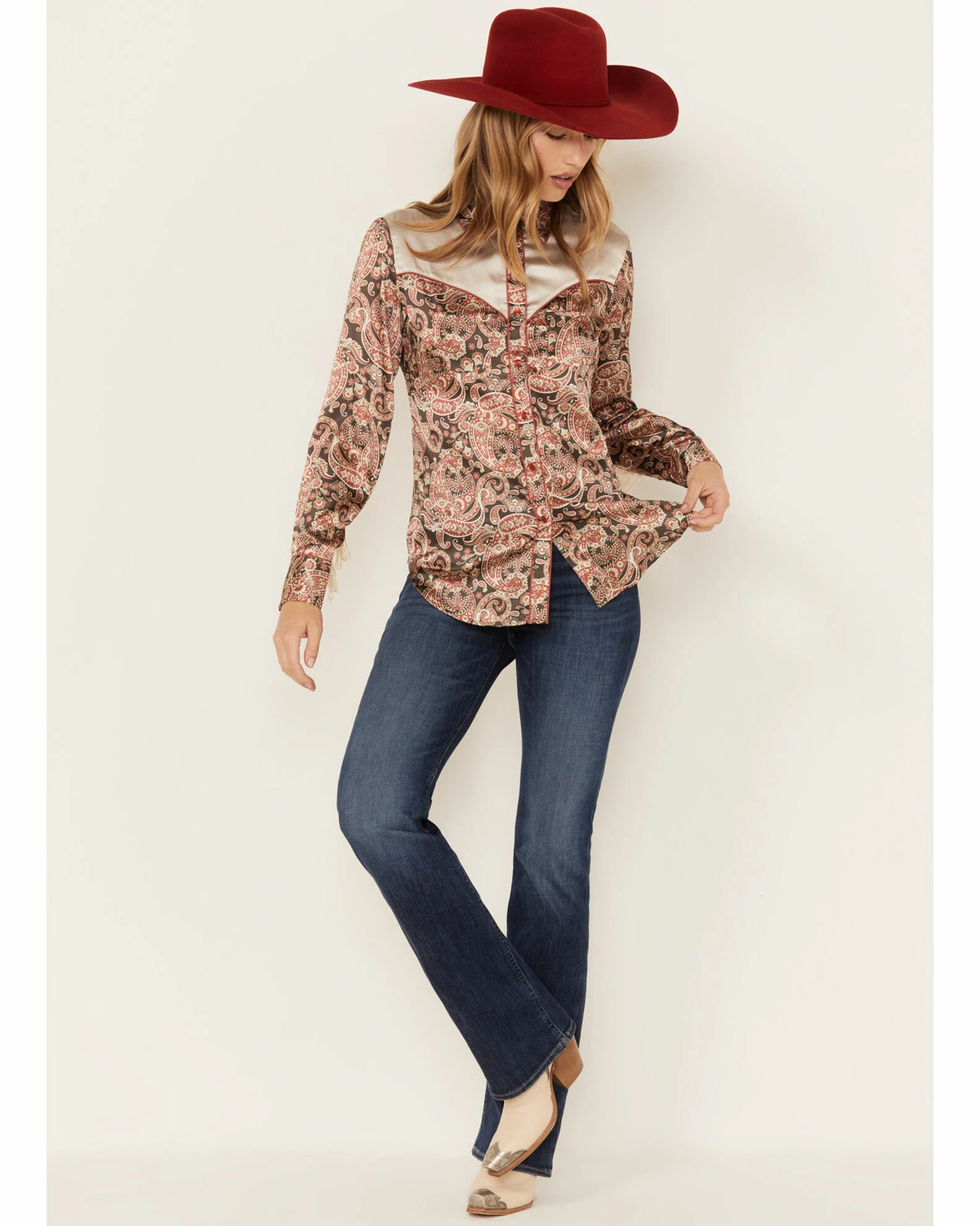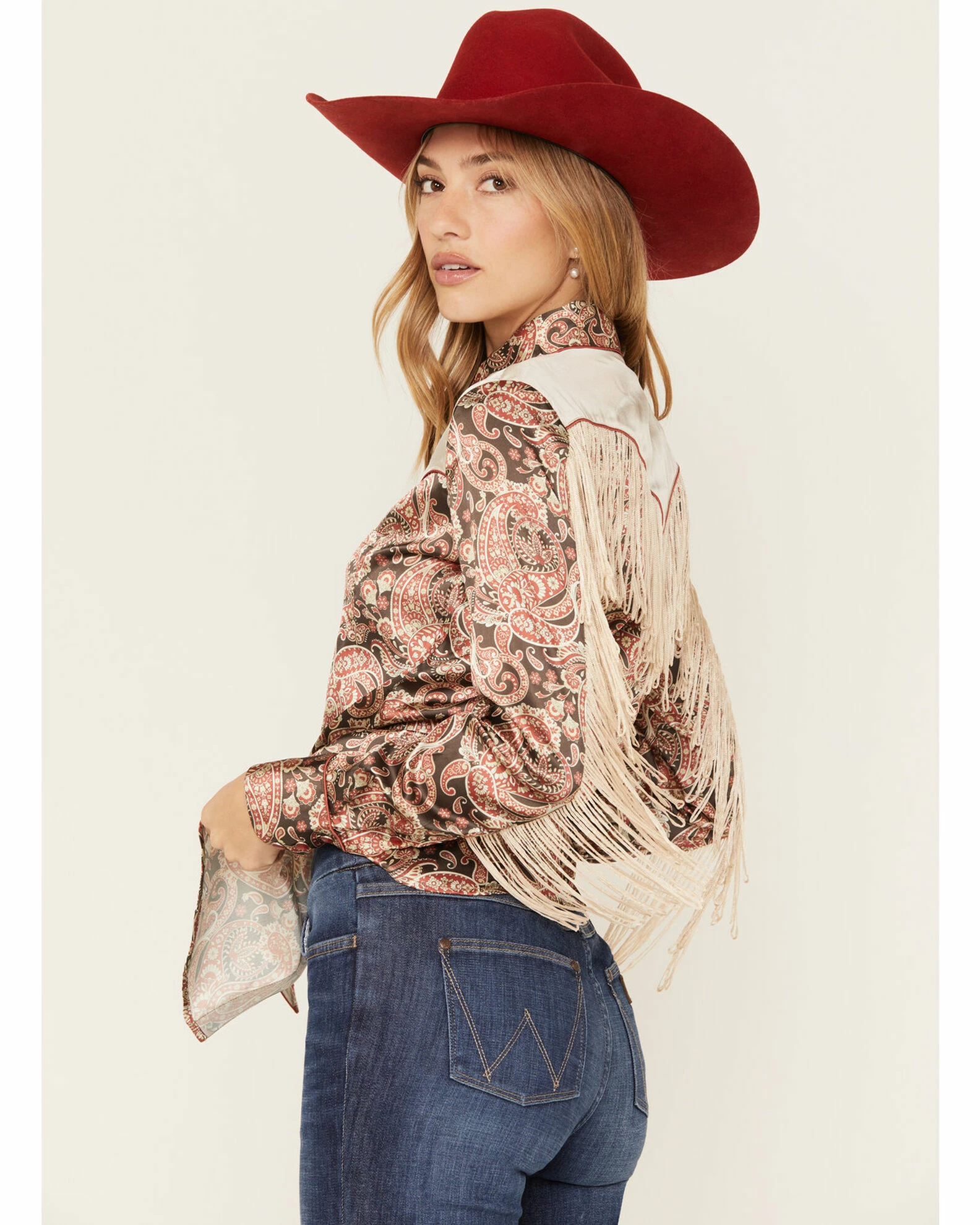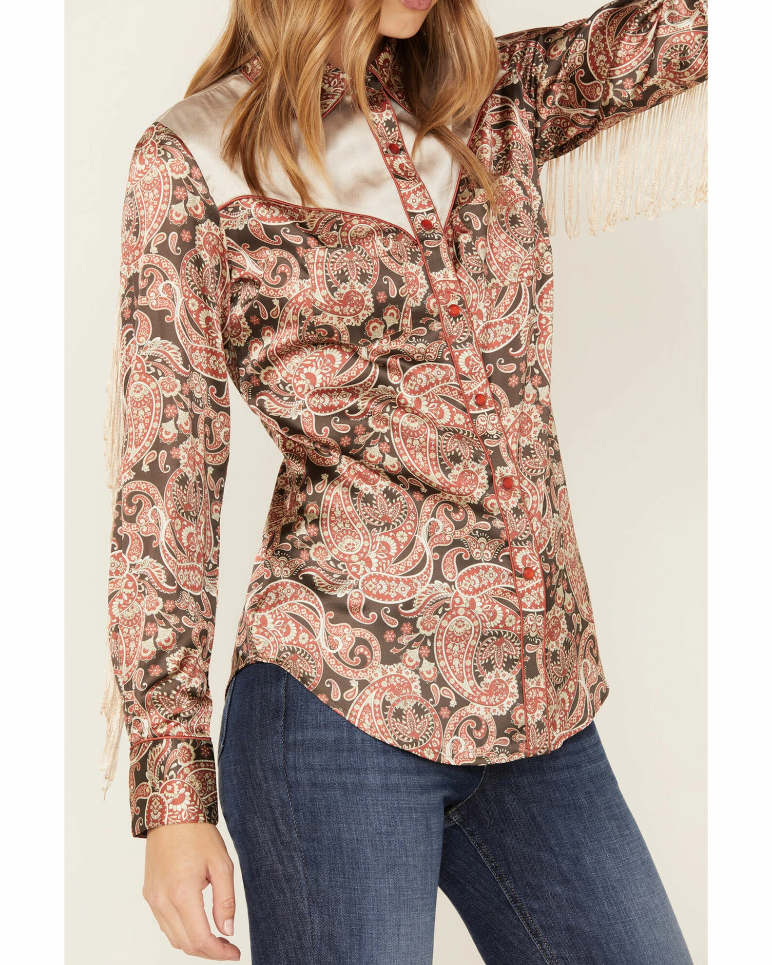 Scully Women’s Satin Paisley Print Long Sleeve Fringe Western Shirt Brown