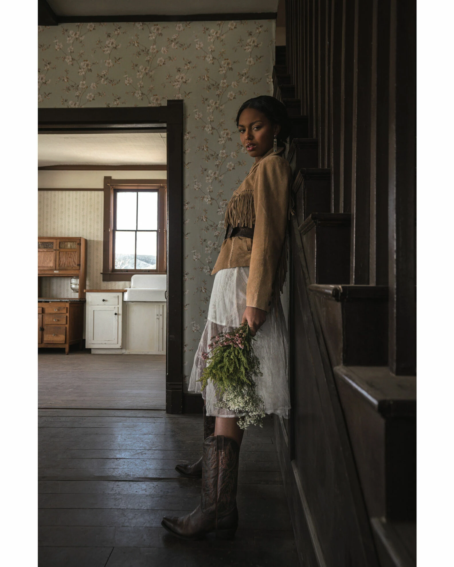 - Western inspired whipstitched lapels run down the front and end of the hemline